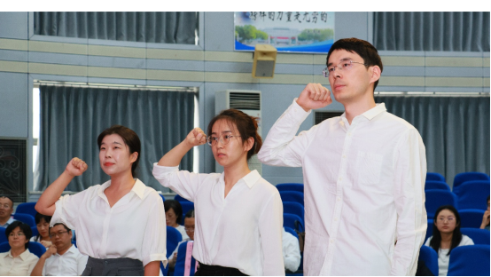 三名新入职教师高举右拳、庄严宣誓。铿锵有力的誓言,是新教师对教育事业的赤诚承诺,期待年轻的老师们扎根304永利集团、扎根304永利集团,书写属于自己的教育篇章。