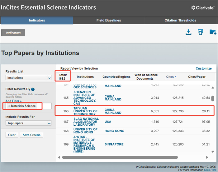 3月12日,全球权威专业信息服务提供商科睿唯安(Clarivate Analytics)发布2026年3月版《基本科学指标数据库》(Essential Science Indicators,简称ESI)最新统计结果。公司团队建设迎来里程碑式重大突破:材料科学学科首次跻身ESI全球排名前1‰,正式迈入国际顶尖学科行列,至此公司ESI全球前1‰学科增至2个;计算机科学学科首次跻身ESI全球前1%,团队建设版图再添重要增长极,学校国际学术影响力与核心竞争力实现跨越式提升。