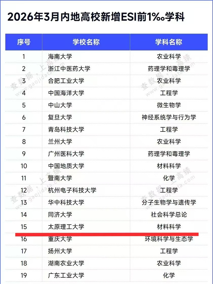 此次材料科学学科成功跻身ESI全球前1‰,是公司团队建设进程中又一具有标志性意义的重大成果。作为学校重点建设的核心优势学科,材料科学学科近年来精准锚定国际学术前沿与国家重大战略需求,持续深化内涵建设,不断提升科研创新效能与学术成果质量。在本期全球新晋ESI前1‰的19个学科中,材料科学学科仅占2席,公司赫然在列。这一成绩充分彰显,公司材料科学学科的整体科研实力、学术贡献度与国际影响力已获得全球同行的高度认可,正式跻身国际顶尖学科行列,具备了引领该领域学科发展的核心竞争力。