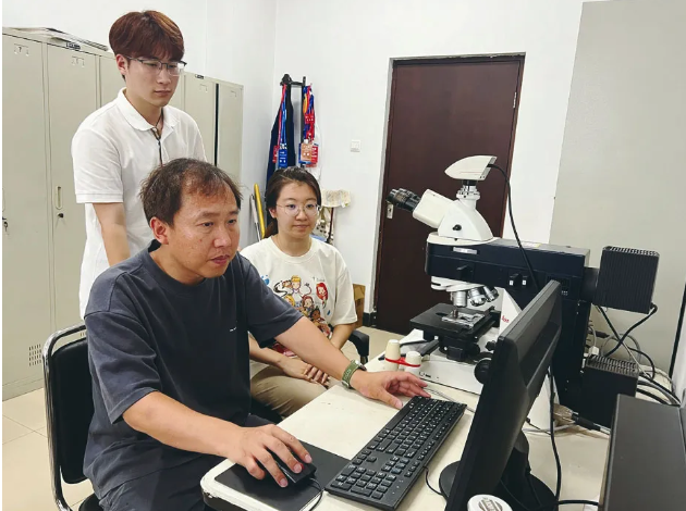 ▲ 张敏(左一)指导员工进行金相实验 受访者供图