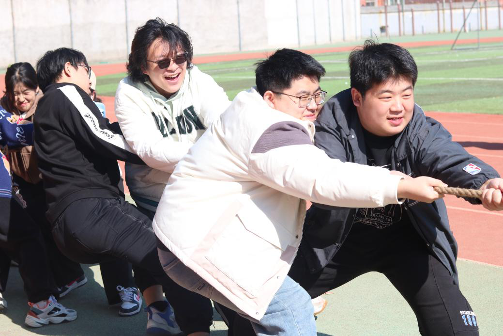 比赛现场气氛紧张而热烈。各组参赛队员积极准备,跃跃欲试。伴随着队长们整齐划一的口号声,观赛同学们热情高涨的加油声、欢呼声此起彼伏,队员们紧握长绳,脚抵着脚,卯足了劲拼命往后拉。