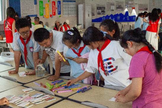 在“疏水涂层”实验中,孩子们用疏水喷雾处理过的纸片模拟荷叶表面。志愿者通过对比实验,揭示疏水涂层的微观结构奥秘,并延伸讲解其在雨衣表面等方面的日常应用也是非常常见。