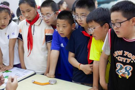 在对比实验中,记忆合金丝在热水里自动恢复原形的特性令孩子们目瞪口呆。志愿者以记忆合金发动机为实例进行现场演示,并解释合金发动机能够转动是因为金属一直奔跑想要找回自己原来的样子。孩子们触摸着温热的合金丝,眼神中充满对未来的憧憬。