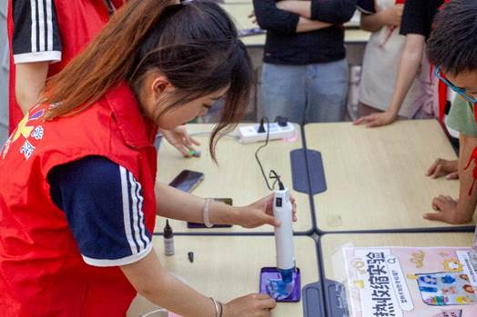 “我的钥匙扣缩小了!”孩子们将亲手操作热吹风机将热缩片缩小,见证图案在高温下缩小定型的魔法时刻。志愿者以包装袋为例,解释热收缩膜如何通过精密控温实现密封保鲜。